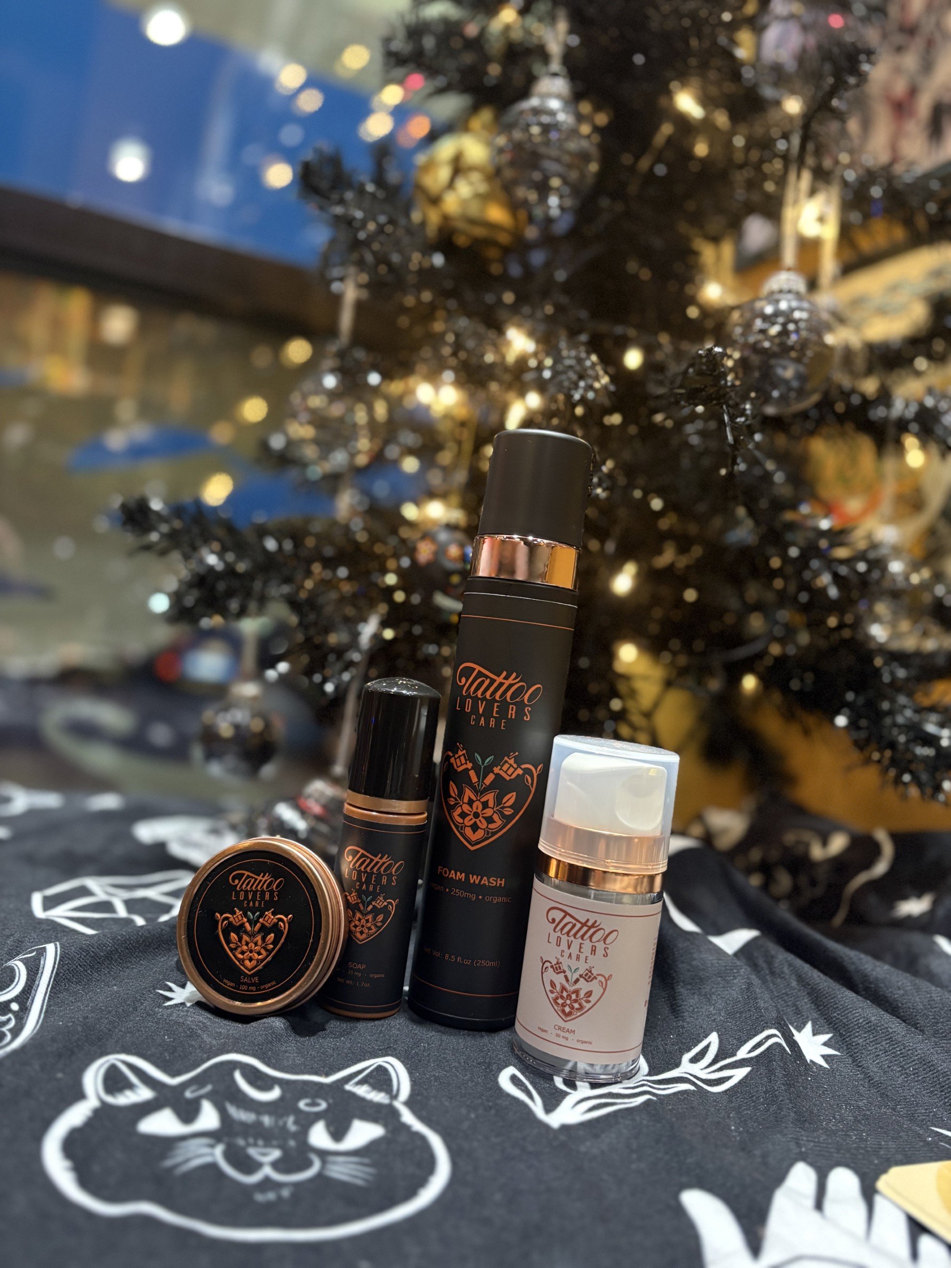 TLC (Tattoo lovers care) Is the ideal brand for your aftercare process, The CBD infused Salve, soap and lotion calm, sooth and protect your tattoos keeping your skin healthy and your tattoos vibrant. We offer a Salve, Lotion, and Soap sold separately or as a bundle for $60. (15% percent off this holiday season)